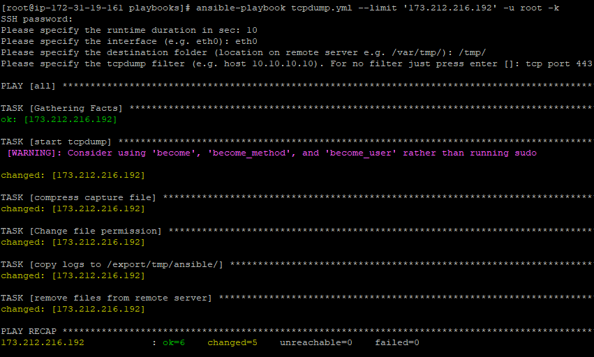 The playbook takes the tcpdump, zip it, change the file permission to be able to copy it, copy the logs to your server and delete the file finally from the remote machine.
